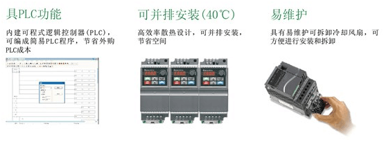 本系列采用彈性模塊的設計,特色是內置PLC功能,可編寫簡易程序儲存與執行;并可外加特殊功能擴展卡及通訊卡,是小馬力型的代表,滿足業界多元化的需求。